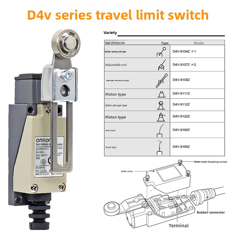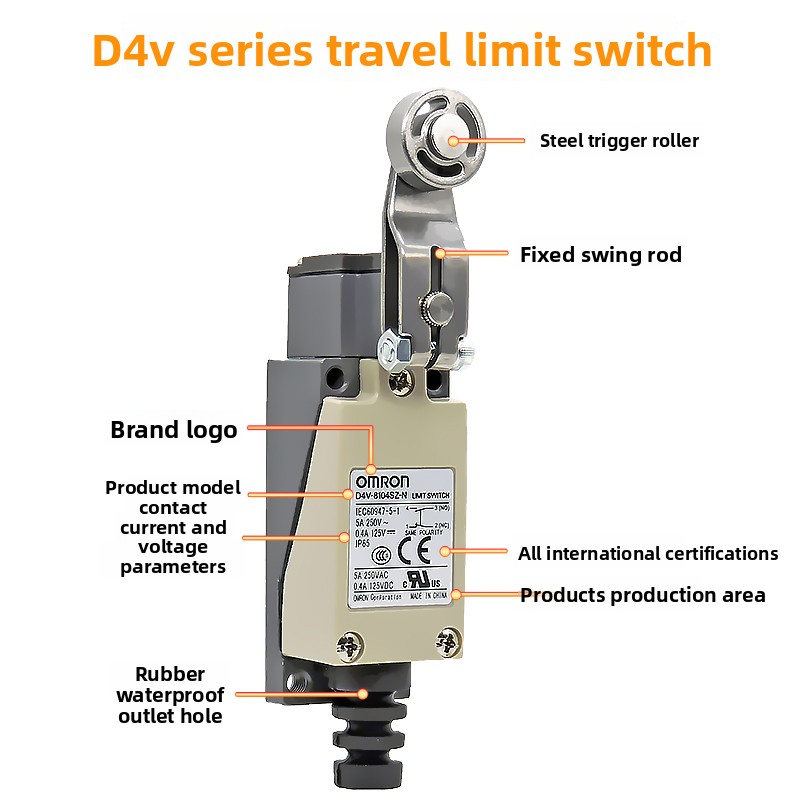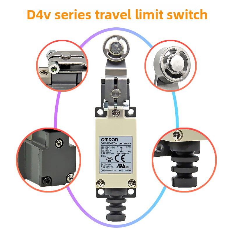 The Omron D4V series of limit switches, including models 8108SZ-N, 8108Z-N, 8104SZ-N and 8111Z, are specifically designed for precise limit control. This series of switches feature a compact structure and sensitive response, making them suitable for position detection and safety protection in industrial automation equipment. High reliability and durability ensure long-term stable operation and meet the usage requirements in harsh environments, making it an ideal choice for achieving precise mechanical motion control.